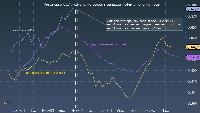 Данные Минэнерго США на этой неделе покажут, что коммерческие запасы нефти за отчетную неделю до 31 мая снизятся на 1.3 млн баррелей. Таков средний прогноз 8 экспертов, опрошенных агентством Bloomberg на момент написания статьи. Ведомство опубликует свою еженедельную статистику по изменению запасов нефти и нефтепродуктов в среду 5 мая в 18:00 мск.