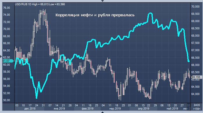 Цены на нефть обрушились по той же причине — на опасениях резкого замедления роста мировой экономики. Вчера JPMorgan отметили, что риск начала рецессии в США во втором полугодии 2019 года увеличился до 40% с 25% месяц назад из-за внешнеторговых конфликтов с Китаем и Мексикой.