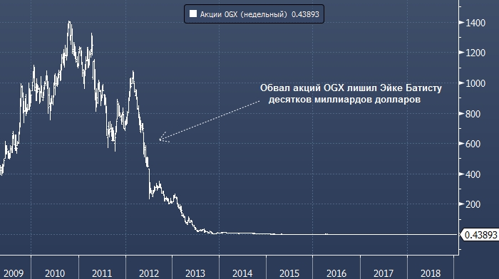 В начале 2012 года состояние бразильца Эйке Батисты оценивалось в $30 млрд с лишним, и он входил в десятку богатейших людей мира. В течение следующего года акции его сырьевой компании OGX рухнули, а сам предприниматель не только лишился статуса миллиардера, но и получил прозвище «человек, который потерял $35 млрд всего за год».
