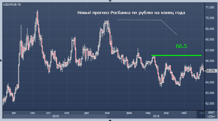 Кумулятивный эффект от покупок валюты Банком России, а также сезонное повышение внешних выплат к концу года будут оказывать давление на рубль, но незначительное. Росбанк также поднял прогноз по росту российской экономики: ВВП России в 2019 году вырастет на 1.5%, а не на 1.2%, как ожидалось прежде. Этому будет способствовать предстоящее снижение ставок Центральным банком и старт нацпроектов. 13 из 17 аналитиков, опрошенных Блумберг, ожидают снижения ключевой ставки на 25 б.п. 14 июня.