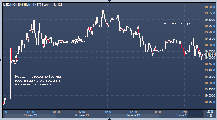 Мексиканский песо растет на торгах в среду — валюта быстро бросила попытки возобновить снижение после заявлений торгового советника Питера Наварро, который в интервью CNN заявил, что пошлины в отношении мексиканских товаром могут и не вступить в силу. Наварро фактически подтвердил прежнюю позицию Белого Дома — такой исход возможен, если Мексика поможет Трампу решить проблему с миграцией, однако участники рынка сфокусировались на его словах о том, что у американской администрации есть трехстороннее «решение».