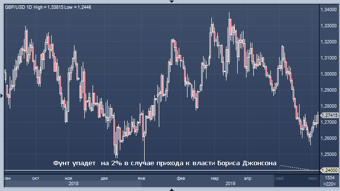 Британский фунт может потерять около двух процентов и вернуться к двухлетнему минимуму, если новым премьер-министром страны станет сторонник жесткого Brexit, бывший министр иностранных дел Борис Джонсон. Таковы результаты опроса, проведенного агентством Bloomberg. Нынешний премьер-министр Великобритании Тереза Мэй не справилась со своими обязанности и под огромным давлением как внутри партии, так и со стороны оппозиции со слезами на глазах в буквальном смысле вынуждена была объявить о своей отставке. Теперь консерваторы выберут себе нового лидера партии, который затем возглавит обновленный кабинет министров.
