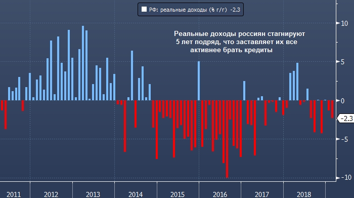 По данным издания, в прошлом месяце почти каждый десятый житель РФ (9%) взял кредит для «адаптации к инфляции», тогда как в прошлом и позапрошлом годах этот показатель составил 2% и 5% соответственно. Треть россиян (32%) осуществляет текущие выплаты по потребительскому кредиту, кредиту не неотложные нужды или в рамках займа по кредитной карте. По данным Минэкономразвития РФ, розничное кредитование в стране растет на 30% г/г (ProFinance.ru: по данным Всемирного банка — на 24% г/г).