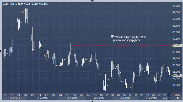 Прогноз JPMorgan по доллар/рублю на конец третьего и четвертого кварталов текущего года составляет 67.