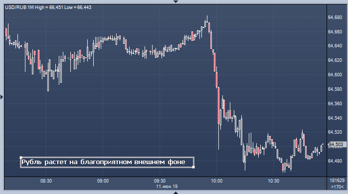 Рубль развивает наступление на доллар и евро во вторник на Московской бирже за счет роста оптимизма на мировых рынках, где поднимаются акции, нефть — немного — и снижается доллар. Рыночная активность может быть пониженной перед завтрашним российским праздником. В первые минуты торгов было достигнуто значение 64.47 рубля за доллар впервые с 28 мая, к 11:06 мск котировки расчетами “завтра” были у отметки 64.50, и рубль дорожает на 0.4%. К евро рубль набирает также 0.4%, и котировки вблизи 73.01.