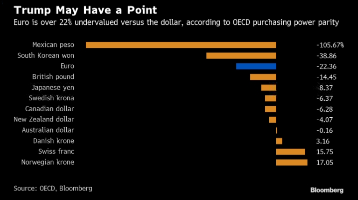 ОЭСР апеллирует к теории паритета покупательной способности. Последние заявления президента США Дональда Трампа в Twitter касательно финансовых рынков показали, что он держит руку на пульсе. Трамп сказал во вторник, что евро «девальвирован» по отношению к доллару, «ставя США в невыгодное положение». Возможно, он не ошибается: единая валюта недооценена на 22% по сравнению с долларом в соответствии с моделью Организации экономического сотрудничества и развития, которая базируется на использовании паритета покупательной способности. Наиболее часто прибегают к подходу, известному как индекс «Биг Мака», для оценки стоимости валюты с помощью теории о ППС. Эта оценка показывает, что евро слишком дешев: на 15% его стоимость ниже справедливой.