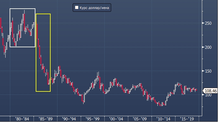 В ходе эскалации торгового конфликта с японцами курс доллар/иена оставался относительно стабильным, хотя валюта США дорожала против остальных конкурентов. Тогда иена считалась очень дешевой, масштабы торговой активности были уже, а США и Япония считались стратегическими партнерами.