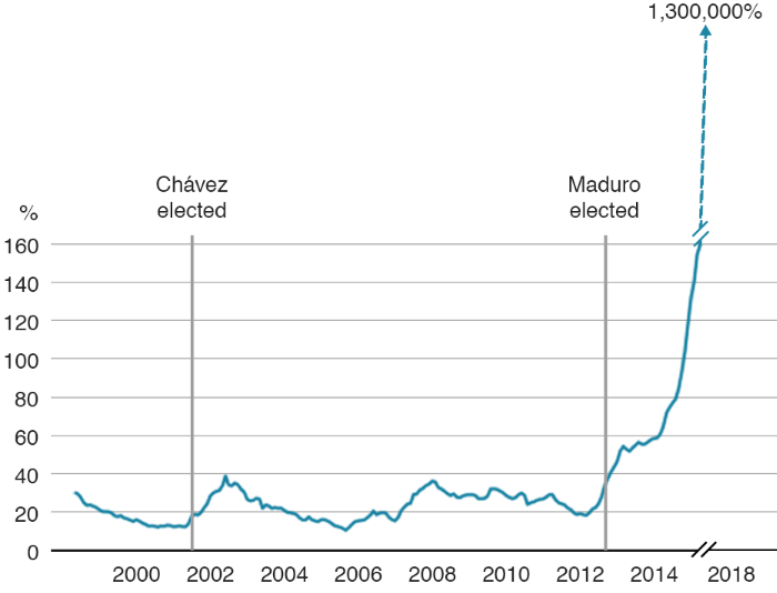 В мае потребительская инфляция в Венесуэле замедлилась до 815 194% г/г с апрельских 1 300 000% г/г, сообщил в понедельник оппозиционно настроенный парламент страны. Таким образом, впервые с 2018 года темпы роста цен опустились ниже отметки в 1 миллион процентов, хотя, по официальным данным ЦБ Венесуэлы, в первые пять месяцев года инфляция составила «всего» 906%. На приведенном выше графике отражена динамика инфляции при Уго Чавесе и Николасе Мадуро.