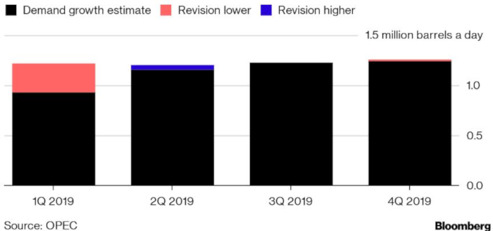 Картель прогнозирует, что мировая экономика останется под давлением во второй половине 2019 года из-за торговых споров, которые формируют неопределенность относительно будущего спроса на нефть.