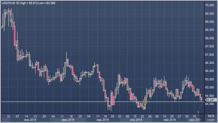 Курс рубля по отношению к доллару на торгах в понедельник 17 июня вырос на 64.13 — самого высокого уровня с 24 апреля. Цены на нефть при этом не являются для российской валюты драйвером роста, поскольку Brent в понедельник дешевеет на 0.84% до 61.49 за баррель. Однако в преддверии заседания ФРС, результат которого будет объявлен в среду 19 июня, рынка акций демонстрируют позитивную динамику. Инвесторы надеются, что Федрезерв намекнет на сокращение процентных ставок, что сделает займы в долларах более доступными. Традиционно это стимулирует спрос на активы стран с развивающимися экономиками.
