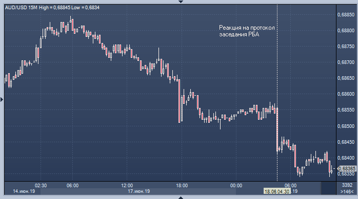 Публикация протокола заседания Резервного Банка Австралии (РБА) от 4 июня, когда он снизил ключевую ставку в первый раз за последние три года с 1.50% до 1.25%, негативно сказалась на динамике аусси в азиатскую сессию.