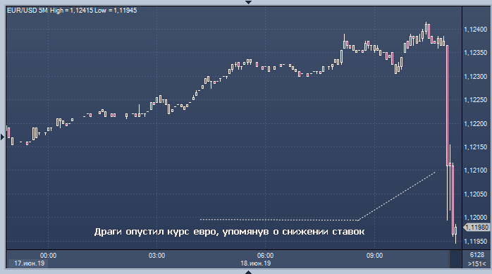 Курс евро полетел вниз. Президент ЕЦБ Марио Драги, выступая во второй день работы трехдневного форума в Синтре, Португалия, упомянул о снижении ставок. Таким образом Синтра уже второй раз преподносит рынкам сюрпризы, застигая трейдеров врасплох. Именно здесь в прошлый раз Драги объявил о скором сворачивании количественного смягчения и вызвал ралли евро. Теперь произошло ровной наоборот. Драги заявил, что снижение ставки является одним из вариантов дальнейшей политики, одним из инструментов.
