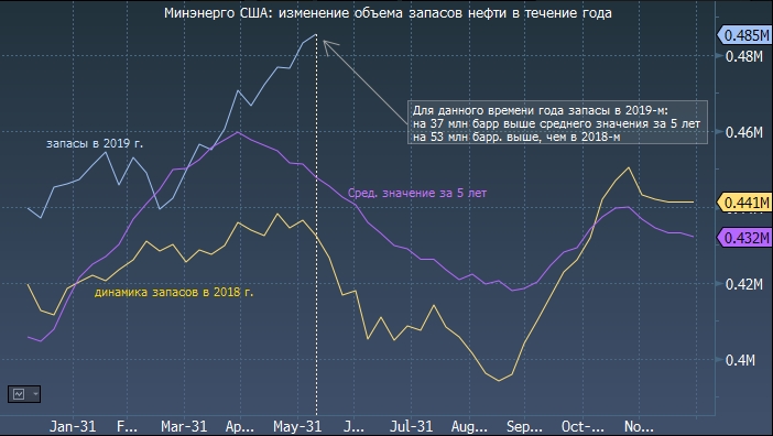 Напомним, на прошлой неделе ведомство (API) опубликовало статистику по состоянию на 7 июня. Запасы сырой нефти, по данным API, выросли на 4.85 млн баррелей. При этом эксперты тогда прогнозировали снижение запасов нефти на 1 млн баррелей. В итоге уже по официальным цифрам от Минэнерго, запасы сырой нефти выросли на 2.2 млн баррелей до самого высокого уровня с июля 2017 года.