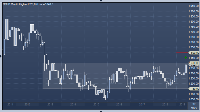 Котировки золота вновь вплотную приблизились в вершине шестилетнего коридора около $1400, и теперь техническая картина вкупе с заметным смягчением позиции ФРС создают предпосылки для дальнейшего роста драгметалла.