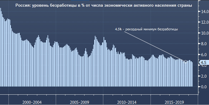Безработица в России в мае сократилась до исторического минимума в 4.5%, следует из данных Росстата. В сентябре 2018 года мы уже видели этот минимум. В апреле безработица составляла 4.7%. Общая численность безработных в России в мае 2019 года снизилась по сравнению с апрелем на 152 тыс. человек и составила 3 млн 402 тыс. человек. Численность официально зарегистрированных безработных в мае снизилась на 41 тыс. человек по сравнению с апрелем, до 776 тыс. человек. Численность рабочей силы, по предварительным итогам выборочного обследования рабочей силы в возрасте 15 лет и старше, в мае 2019 года составила 75.0 млн человек, или 51% от общей численности населения страны.