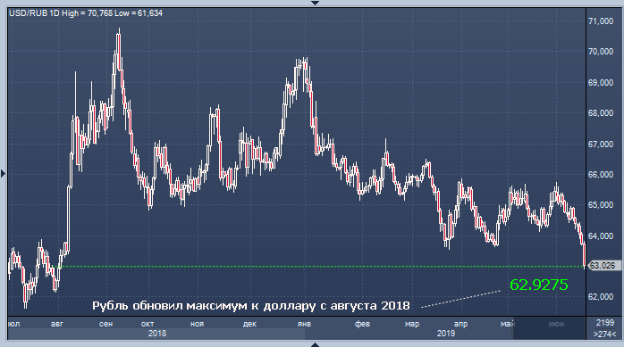 Курс доллара на Московской бирже в четверг опустился до минимального уровня с 1 августа 2018 года — 62.9275 рубля за единицу американской валюты. Очень долго покупатели сопротивлялись на отметки 63 рубля ровно. Вероятно, это могло быть связано с защитой опционного барьера, поскольку сегодня происходит экспирация опционных и фьючерсных контрактов в России.