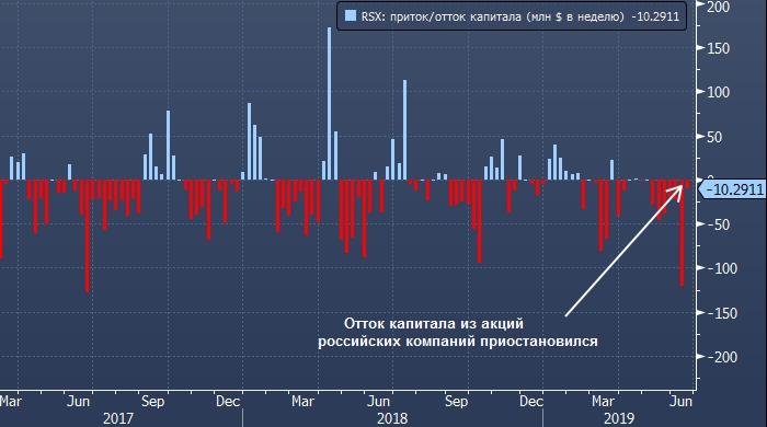 За неделю до 21 июня биржевые фонды (ETF), торгующиеся на биржах США и ориентированные на акции и облигации российских эмитентов, зафиксировали отток капитала в $6.9 млн. Неделей ранее, т. е. после снижения цен на нефть и накануне заседания ФРС, аналогичный показатель составил целых $115.6 млн.