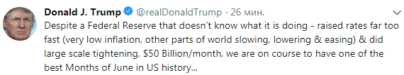 «Несмотря на то, что ФРС сама не знает, что делает (слишком быстро и сильно повысила ставки несмотря на низкую инфляцию, замедление в других странах и смягчение денежно-кредитной политики другими центробанками…), июнь может стать одним из лучших месяцев в истории США», - сообщил в твиттере Дональд Трамп. - «Подумайте о том, что могло бы быть, если бы ФРС поступала правильно».
