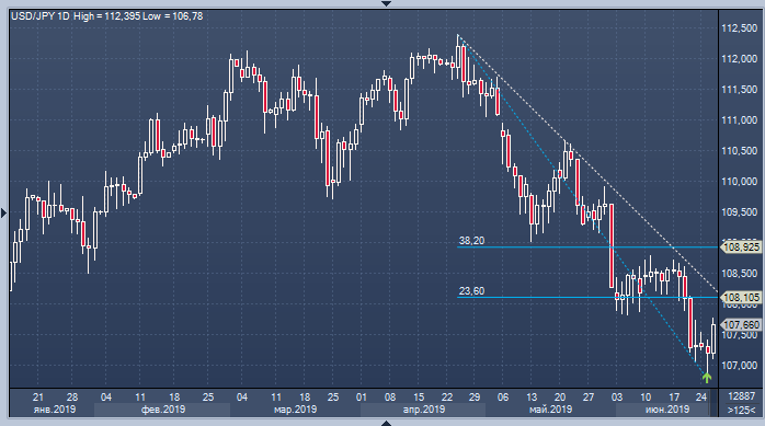 Курс доллара к иене сегодня демонстрирует позитивную динамику, и валютные стратеги Societe Generale полагают, что у пары есть шансы на некоторое восстановление — в пользу паузы в нисходящем тренде говорит формирование «молота» на дневном графике по итогам торгов во вторник. Однако в банке обращают внимание на то, что в целом техническая картина остается негативной — пара остается в рамках нисходящего канала, а положение дневного стохастика не предполагает потенциала для значимой коррекции. Прорыв верхней границы последнего в районе 108.10, где также проходит 23.6% от снижения с апреля, может придать импульс для роста, но в SG не думают, что у быков хватит сил для возвращения выше 108.81/92, и советуют возобновлять продажи при подобном развитии событий. В банке отмечают, что целями для медведей остается линия тренда с 2016 года в районе 106 и граница многолетнего треугольника в области 104.55/103.58.