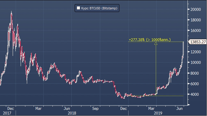 Курс биткоина на торгах в среду 26 июня достиг 18 месячного максимума и поднялся до $13 722 за монету. Последний раз такую цену можно было наблюдать 18 января 2018 года. Однако это далеко не все рекорды цифрового флагмана.