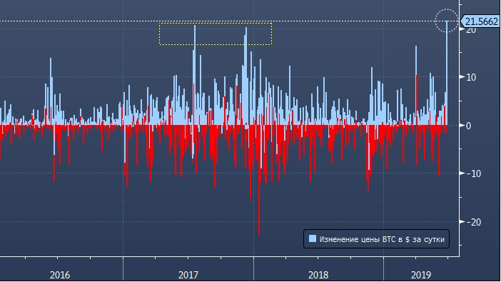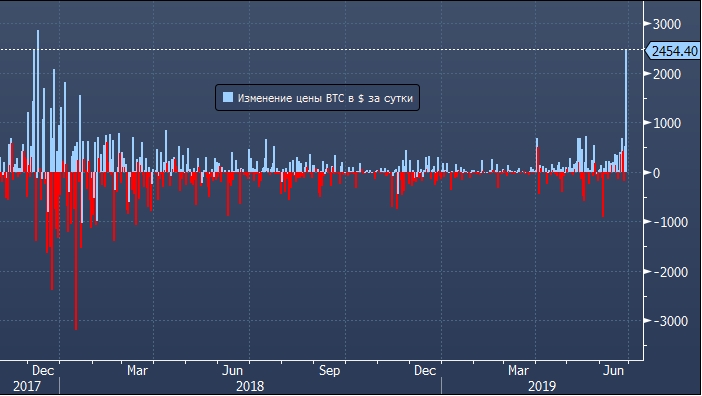 В абсолютном значении биткоин подорожал за день 26 июня на 2 454 доллара. Это максимальный прирост с середины декабря 2017 года, когда участники цифрового сообщества ожидали появление биткоин-фьючерсов на Чикагской товарной бирже (CME).