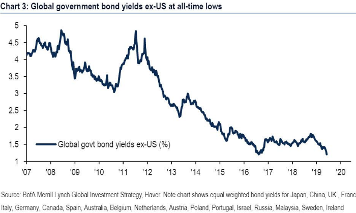 Снижение среднемировой доходности облигаций выглядит логичным, так как большой уровень долговой нагрузки препятствует росту экономики и, следовательно, инфляции. Поэтому, чем больше долга, тем ниже его доходность (теоретически). По данным Bank of America, среднемировая доходность суверенных облигаций достигла рекордно низких значений (см. график в начале статьи).