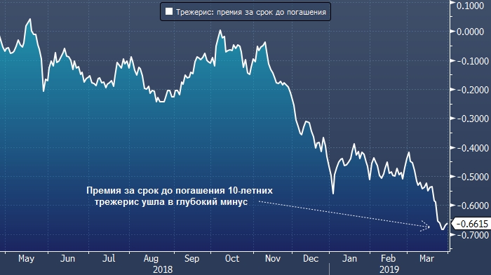 Лидеры долгового рынка, вроде Pimco, Amundi и Lombard Odier Investment Managers, не верят в рост доходности на сколько-нибудь обозримом горизонте. Однако тревогу вызывает тот факт, что так называемая «премия за срок до погашения», т. е. компенсация, которую инвестор получает за владение долгосрочной облигацией относительно краткосрочной, недавно достигла рекордно низких значений, уйдя в минус (см. график ниже). Ненормальность ситуации подтверждается, например, и тем, что на прошлой неделе в отрицательную территорию ушла доходность 45-летних швейцарских бондов.