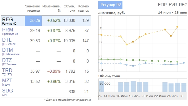 На Санкт-Петербургской международной товарно-сырьевой бирже в четверг 27 июня бензин марки Регуляр-92 вырос в цене на 0.52% до 35.26 руб. за литр. При этом Премиум-95 подорожал на 0.87% до 39.19 руб. за литр. Августовские ($61.00 за баррель) и сентябрьские ($60.80 за баррель) фьючерсы на нефть марки Urals не торговались. Отметим, что более дальний контракт стоит дешевеле более близкого. Дневной объем на рынке нефтепродуктов составил 83 057 тонн или 3.73 млрд рублей.