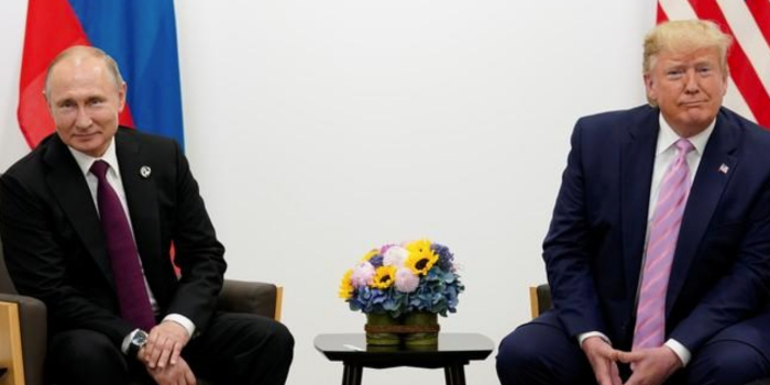 Президент США Дональд Трамп и президент РФ Владимир Путин на саммите G20 в Осаке, Япония, 28 июня 2019 года. REUTERS/Kevin Lamarque