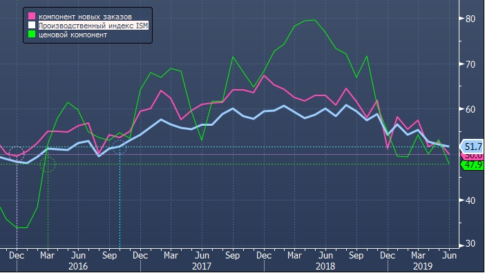 Согласно информации, которая была опубликована в понедельник институтом управления поставками, индекс ISM в июне снизился до 51.7 пункта по сравнению с 52.1 пункта в мае и прогнозом 51 пункт. Это самое низкое значение с октября 2016 года.
