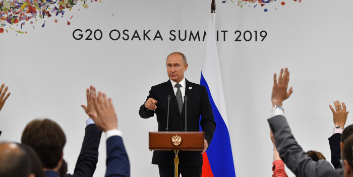 Президент России Владимир Путин во время пресс-конференции на полях саммита G20 в Осаке. Юрий Кадобнов / AFP / Getty Images