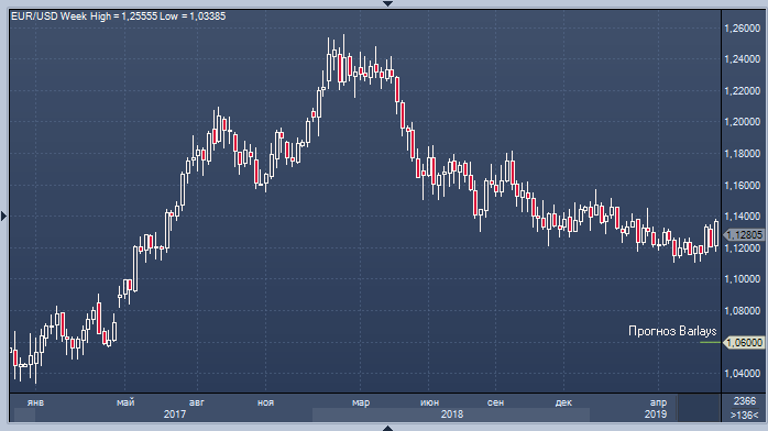 Barclays ожидает, что EURUSD к концу этого года упадет к 1.11, в первом квартале 2020 года снизится к 1.08, а во втором — до 1.06. В банке отмечают, что Брекзит, вопросы фискальной устойчивости Италии, а также возможность введения новых пошлин в отношении европейских товаров Трампом предполагают риски того, что масштабы падения пары окажутся более значительными.