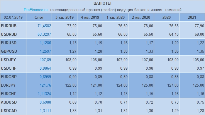 - Прогноз по доллару к рублю на 3 и 4 кв 2019: было в июньском прогнозе - 65.11 и 66.00, стало в июльском прогнозе - 65.00 и 65.60 соответственно