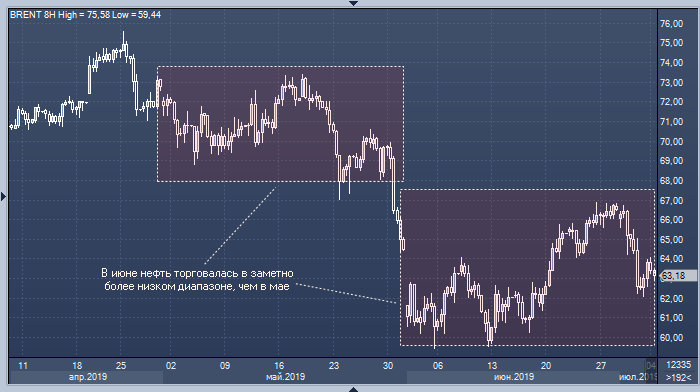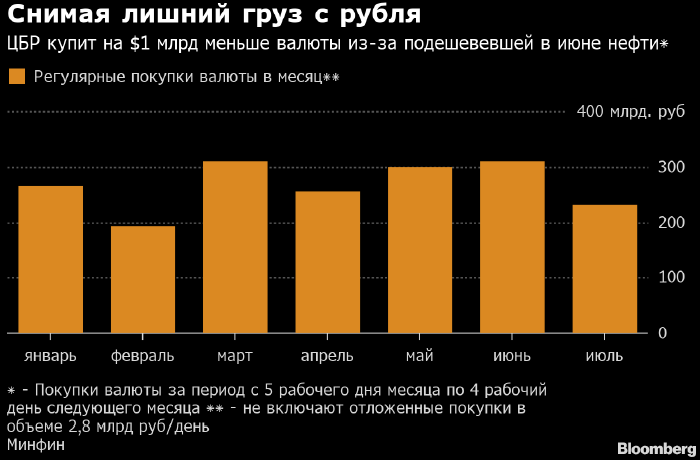 В июне средняя цена нефти оказалась заметно ниже, чем в мае (см. график ниже), поэтому в период с 5 июля по 6 августа Минфин в рамках бюджетного правила купит валюты на 231 млрд рублей, т. е. почти на 80 млрд рублей меньше, чем в период с 7 июня по 4 июля. Таким образом, ежедневный объем валютных интервенций должен составить около 10 млрд рублей, что станет минимальным значением с февраля.