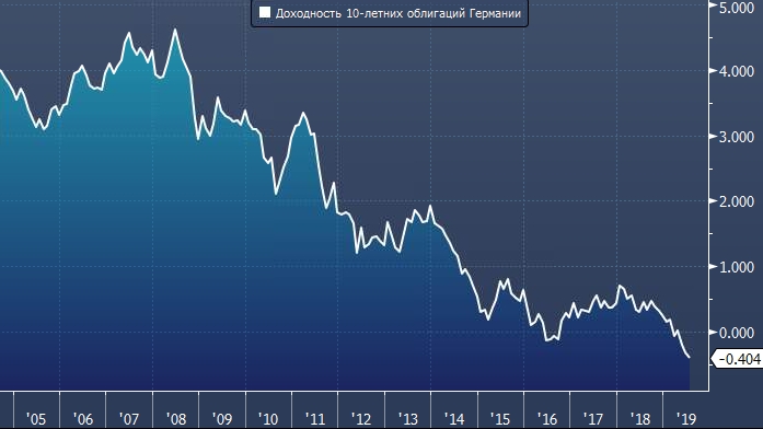 Доходность десятилетних немецких облигаций упала на этой неделе на 8 базисных пунктов. В четверг она откатилась до минус 0.41% годовых. Доходность итальянских бумаг упала до минимума с 2016 года, а спред их доходности с бундесами упал ниже 200 базисных пунктов впервые с мая прошлого года. Процентные ставки десятилетних облигаций Бельгии, Франции и Нидерландов также являются отрицательными.