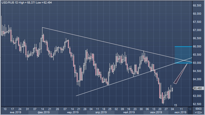 В середине июля давление на российскую валюту может возрасти, так как часть выплаченных российскими компаниями дивидендов их получали могут захотеть конвертировать в валюту. Аналитики компании «Открытие Брокер» прогнозируют, что в 2019-м объем российских дивидендов на 43% больше, чем в прошлом году.