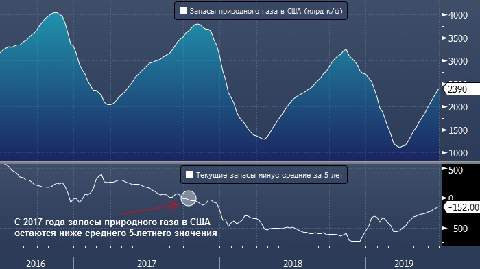 В последнюю неделю июня запасы природного газа в США составляли 2390 млрд куб/футов, что на 3.7% выше, чем неделей ранее, но на 6.4% ниже среднего пятилетнего значения. При этом за прошедший год объем запасов газа вырос на 10.4%, что и объясняет недавний обвал цен.