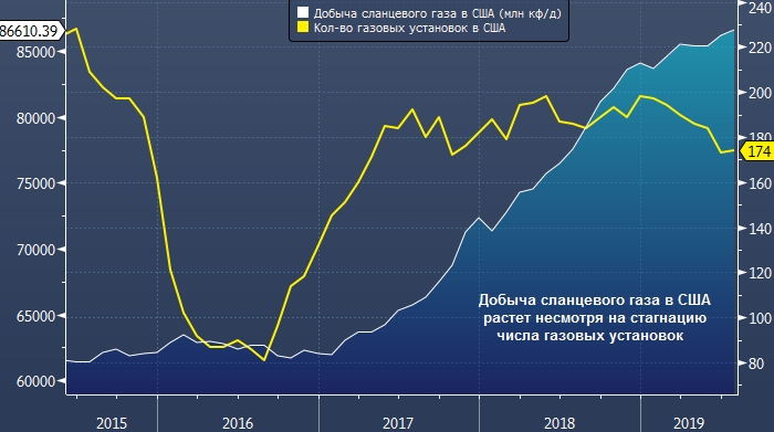 Объем добычи газа в США пока растет, хотя количество активных буровых снизилось с 200 штук по состоянию на начало года до нынешних 174 штук.