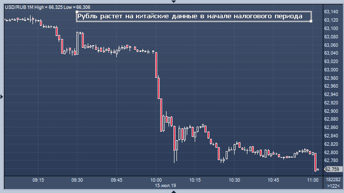 Курс рубля немного укрепляется утром в понедельник, отыгрывая позитивную статистику из Китая, которая отправила рисковые активы вверх, а фьючерсы на американские индексы — к новым историческим максимумам. И хотя ВВП КНР во втором квартале замедлился до самых слабых с начала 2009 года темпов роста в 6.2%г/г, китайское промпроизводство в июне показало рост сильнее прогнозов, на 6.3% против майского показателя в 5.0%, а розничные продажи выросли в и этом месяце на 9.8%г/г после увеличения на 8.6%г/г в мае.