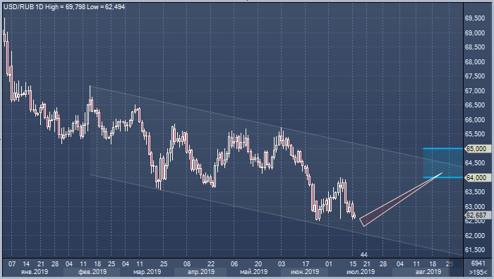 В понедельник рубль заметно укрепился и вплотную приблизился к минимумам текущего года в районе 62.50, которые были сформированы 25 июня. Вышеназванная отметка является лучшим курсом рубля с 1 августа 2018 года. При этом рубль с начала года подорожал к валюте США на 9.8%.