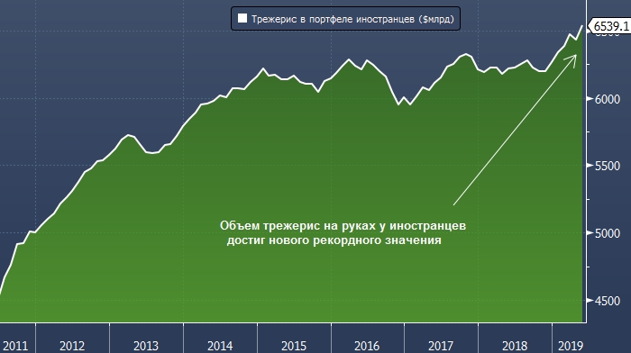 Несмотря на продажи трежерис иностранными официальными лицами, объем этих бумаг в портфеле крупнейших иностранных держателей достиг нового рекордного значений (см. график выше).