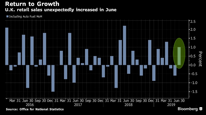Розничные продажи в Великобритании неожиданно выросли в прошлом месяце, закончив слабый второй квартал на позитивной ноте. По данным Управления национальной статистики, опубликованным в четверг, в июне объем проданных товаров через магазины и онлайн-магазины вырос на 1% после снижения за предыдущие два месяца. Экономисты, опрошенные Bloomberg, предсказали еще одно падение.