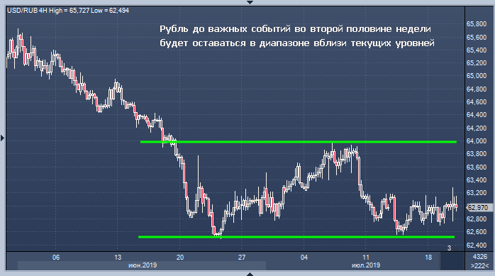 Рубль незначительно укрепляется утром в понедельник, находясь чуть ниже отметки 63.00 за доллар, точки последнего равновесия спроса и предложения. Экспортеры продают валютную выручку для уплаты налогов, а иностранцы покупают ее, конвертируя полученные в России дивиденды. Нефть начала более активно расти в последний час на фоне обострения ситуации в Персидском заливе нефть. Дальнейший рост окажется рублю поддержку. Однако главное событие ближайших двух недель — встреча ФРС, которая в следующую среду снизит ставки. А в ближайшую пятницу ставки снизит Банк России, правда непонятно, насколько — 25 или 50 пунктов.