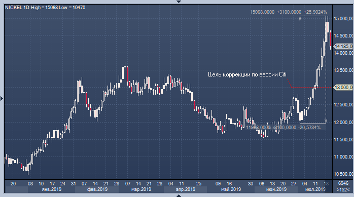 На данный момент падение удалось остановить на уровнях вблизи $14 100, но аналитики Citi обращают внимание на то, что, несмотря на снижение, металл остается очень сильно перекуплен, и локальная техническая картина говорит в пользу развития коррекции в направлении $13 000 за тонну. В банке с оптимизмом смотрят в будущее и ожидают, что средняя цена никеля в 2020 году достигнет $14 000 на фоне роста дефицита, который в следующем году станет более значительным, а после 2023 года и вовсе поднимется до $16 000. Однако агрессивное ралли цен в последние дни в Citi считают чрезмерным.