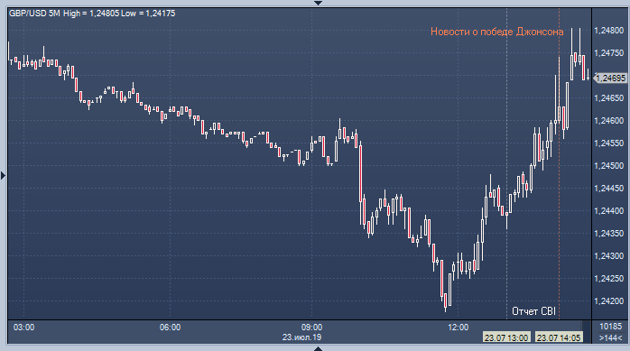Фунт сегодня демонстрировал уверенное снижение, однако к полудню настрой участников рынка резко изменился, при этом его улучшению не помешали даже слабые данные Конфедерации британских производителей. С еще большим энтузиазмом покупать фунт продолжили и после новостей о том, что Борис Джонсон одержал победу в борьбе за кресло премьер-министра Великобритании. Ветераны рынка связывают такую реакцию с реализацией стратегии «продавай на слухах, покупай на фактах» — победа ярого сторонника Брекзита любой ценой была ожидаема и учтена в ценах.