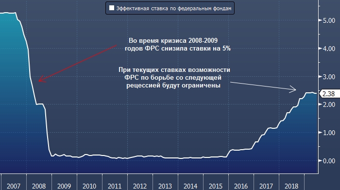 На этот раз ФРС не сможет всех спасти, и мир погрузится в хаос, уверен господин Рикардс. По его словам, обычно для выхода экономики США из рецессии, которая вполне может наступить после выборов президента в 2020 году, требуется снижение ставок на 4-5%, поэтому при их текущем уровне в 2.25% возможности ФРС будут сильно ограничены (см. график в начале статьи).