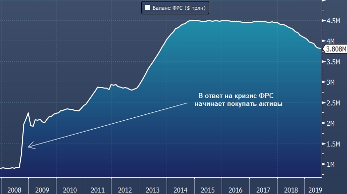 Регулятору придется быстро снизить ставки до ноля и запустить новую программу покупки активов (QE4), т. е. фактически включить печатный станок. Но как это сделать, когда баланс ФРС и так составляет почти $4 трлн (ProFinance.ru: в 2014-2017 годах он колебался в области $4.5, см. график ниже)? Регулятор достиг предела своих возможностей и исчерпал лимит доверия, поэтому в следующую рецессию он мало что сможет сделать, отметил эксперт.