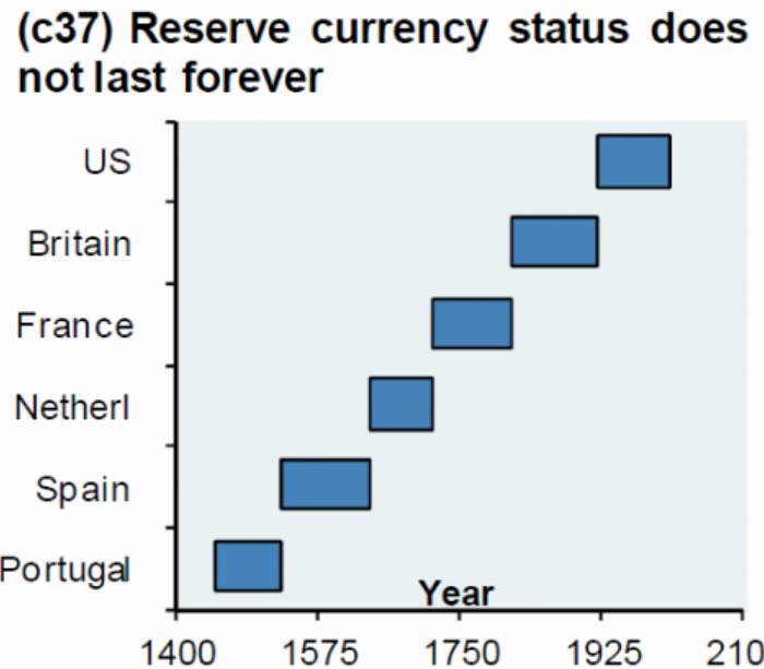 Однако нет никаких основания считать, что доминирование доллара будет продолжаться вечно. На протяжении истории статус мировой резервной валюты переходил из рук в руки по мере смещения мировых экономических центров.