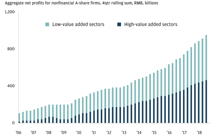 За последние 70 лет доля китайской экономики в мировой выросла в четыре раза и достигла 20%, что лишь немногим уступает текущей доле США. По прогнозам, этот тренд продолжится (см. график выше). Китай перестал быть фабрикой по производству дешевой продукции, и прибыль его компаний все больше формируется в секторах с высокой добавленной стоимостью, вроде технологического (см. график ниже).