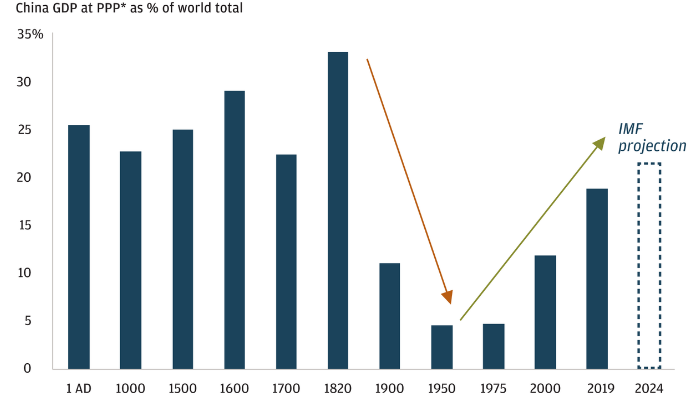После окончания Второй мировой войны США стали крупнейшей мировой экономикой, на долю которой приходилась четверть мирового ВВП. Если добавить сюда другие страны Западной Европы, то это значение вырастет до 40%. С тех пор быстрорастущая Азия, в сердце которой находится Китай, неумолимо отвоевывает у Запада долю мирового рынка.
